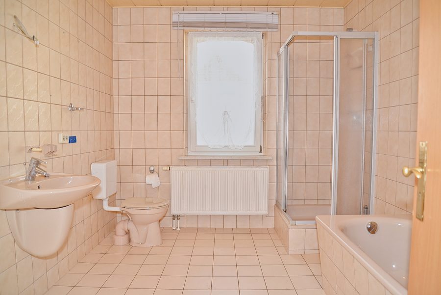 - Badezimmer mit Dusche, Badewanne, WC, Handwaschbecken und Platz für Waschmaschine und Trockner