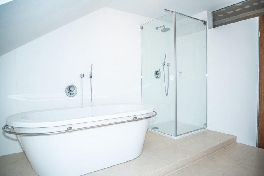 - Badezimmer mit Wanne, Dusche und 2 Handwaschbecken